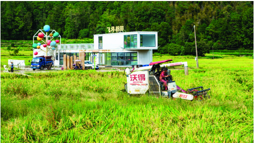 10月15日,在上垟乡的120亩“飞垟稻田”同心共富基地里,金色的稻浪随风起伏,收割机在田间轰鸣作业,村民们忙着装运新收的稻谷,脸上洋溢着丰收的喜悦。