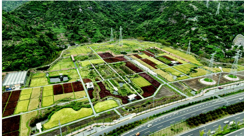 该生态农业田园的前身是黄岩郊野公园,其地理位置优越,毗邻内环北路,且紧邻黄岩石窟景区。作为一项兼具生态价值与民生意义的工程,它也是九峰山风貌建设工程的重要组成部分。在区域设计过程中,始终秉持“生态优先”原则,注重保留原有农田肌理,将原先的菜园、农田升级改造为色彩丰富的多彩农田景观;同时,园内还精心设置了游步道与凉亭,并巧妙连接自然水系,营造出兼具观赏性与生态性的湿地景观效果。
