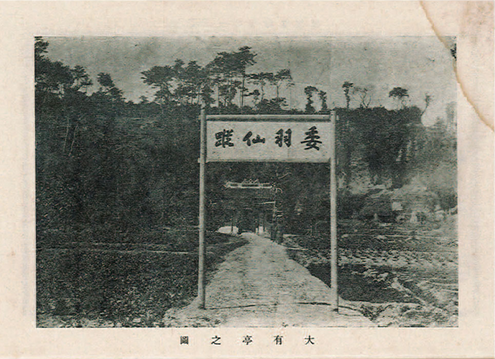 此外,《羽山听松图题咏集》中还留下了四桢特别珍贵的委羽山摄影档案,依原题分别是《蔡心斋大师近影》(照片中“龟道人”悠闲静坐、手执道书,左立一眉清目秀、同着道袍的小道童)、《黄岩委羽山大有宫之图》(系宫观俯瞰视角)、《大有亭之图》(路口立有一招牌,匾额题“委羽仙踪”)、《薜萝亭之图》(为亭前四立、亭内一坐共五位道人之合影),这些作品忠实记录了史上委羽仙山的道家、道境、道人风貌,唯一可惜的是摄影者大名已无从考查。