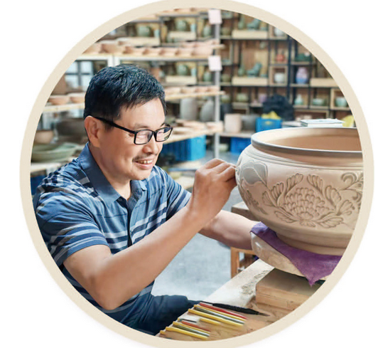 陶正生,自幼在这片瓷韵悠长的土地上成长,耳濡目染之间,他对青瓷产生了深厚而独特的情感。家乡的水土不仅养育了他,也滋养了他对绘画与雕刻艺术的天然热爱。他系统学习陶瓷艺术的设计与创作,多方求师、深入钻研,致力于复原沙埠青瓷的传统烧制技艺。凭借持之以恒的实践与探索,终于让几近湮没的沙埠青瓷制作技艺得以重现光芒,在新时代再度熠熠生辉。