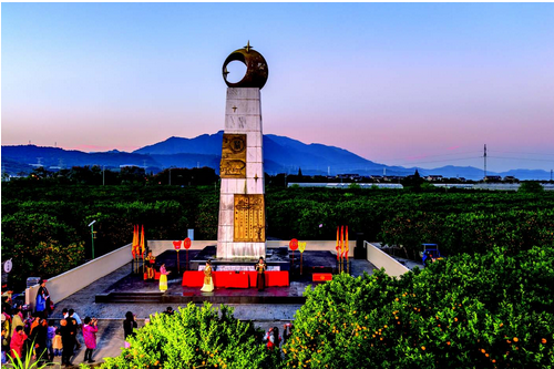 活动在“祭橘神”仪式中拉开帷幕,区乡村大使协会的文艺爱好者们身着汉服聚集在黄岩蜜橘始祖地纪念碑前,祭祀橘神,庆祝蜜橘丰收。据考,此俗源于农耕时代,是橘农感谢当年收成、祈愿来年风调雨顺的重要传统。仪式包含起鼓、鸣金、呈献祭品、诵读祭文等环节,表达了人们对自然的敬畏与对丰收的期盼。“我是专程从上海过来的,第一次亲眼看到‘祭橘神’,非常震撼。”游客章丽表示,“这让我感到黄岩蜜橘不只是一颗水果,它背后有很深的文化根脉。”
