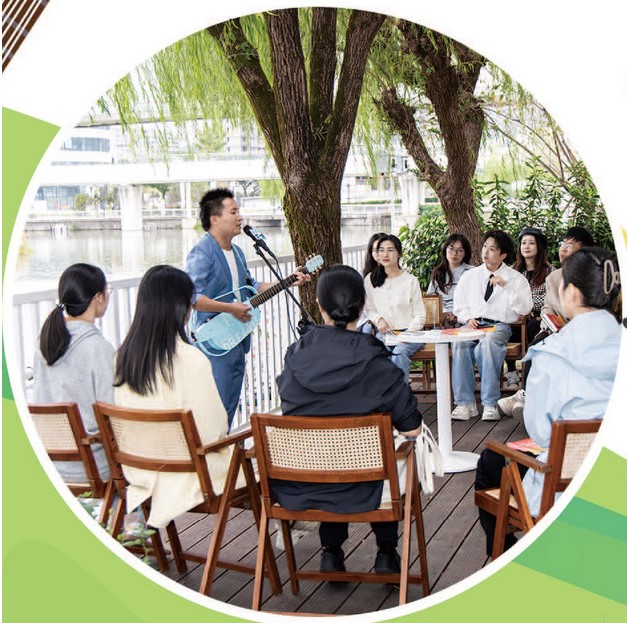 “黄岩的绿水青山,听我唱给你听……”吉他声轻轻响起,悠扬的旋律在陈丹艳玫瑰书房的暖光下流淌。十余张年轻的面庞围坐一圈,有人弹唱伴奏,有人击掌合拍,有人手持话筒,娓娓道来身边的故事——这不是普通的聚会,而是一场围绕党的二十届四中全会精神展开的别开生面的学习分享会,也是“青春小蓝巴”青年理论宣讲团的日常缩影。在这里,理论不再是书本上的铅字,而是可听、可感、可共鸣的青春声音。“从培植文化自信,到塑造健全人格,再到激发创新潜能——这就是我作为一名幼儿教师,对‘办好人民满意教育’的实践理解。”宣讲员李振宇在分享学习体会时这样说道。围绕党的二十届四中全会精神,他结合幼教工作实际,表达了自己对教育使命的深切体悟,并表示将在日常教学中践行全会精神,为孩子的全面成长筑牢根基。