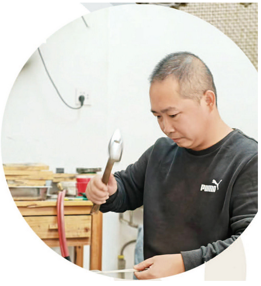 “他要求很高,纹样不能有一点偏差。”外甥鲍林涛学艺两年,天分与勤奋俱佳,如今已能独立完成从制胚到錾花的全套工艺,复刻的传统纹样分毫不差,几乎出师。“他能静心,是块好料子。”王勇看着外甥专注工作的背影,眼中满是欣慰。