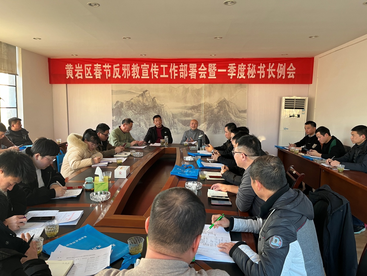 为增强基层群众反邪教意识,高质高效做好新一年的反邪教工作,抓住春节重要节点,集中开展反邪教宣传教育活动,营造欢乐祥和的节日氛围。1月10日,台州市黄岩区反邪教协会于三楼会议室召开2025年春节宣传工作部署会暨第一季度秘书长例会,各乡镇街道分会秘书长,第一、二职业技术学校反邪教协会秘书长,区委政法委、区反邪教协会相关人员等30余人参加,区委政法委副书记潘朝阳出席并讲话,会议由区反邪教协会林理事长主持。