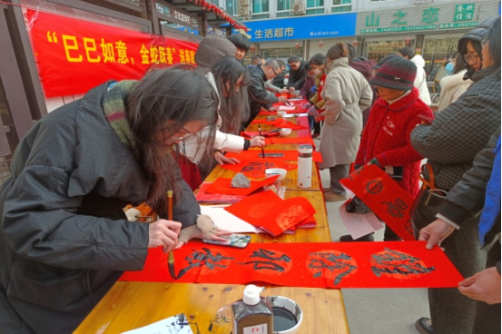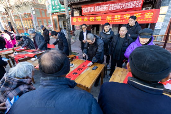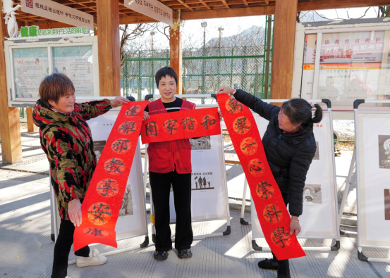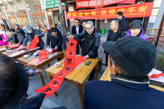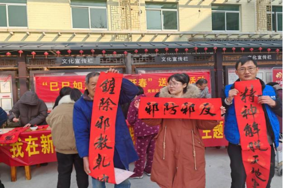 喜气临门红色妍,家家户户贴春联。贴春联是中华传统文化习俗,象征给人们带来喜庆、欢乐、祥和、平安的美好祝愿。活动现场,书法家们忙碌着为村民群众书写春联、赠送福字,同时还书写了不少反邪教对联:“万众一心崇科学,远离邪教享安康”、“阳光万丈驱邪雾,正气一身拂清风”等等,倡导群众反对邪教,破除迷信,崇尚科学,传播文明。工作人员现场向村民群众发送反邪教宣传资料,讲解邪教与宗教的区别以及邪教的本质和危害,把反邪教宣传融入迎新送福写春联文化活动之中,让村民群众意识到防邪、反邪对实现美好生活的重要意义。