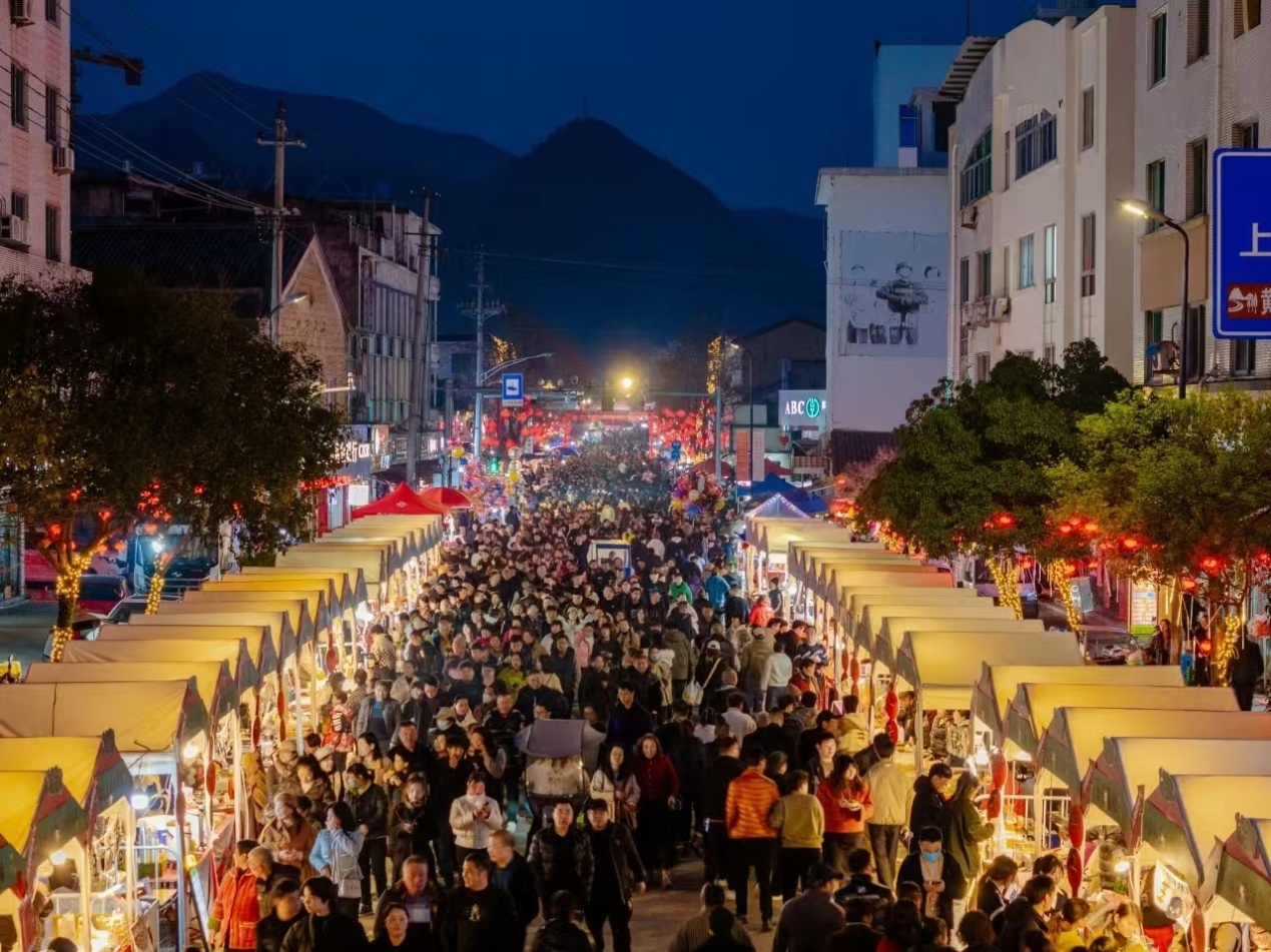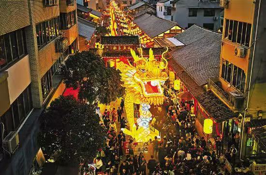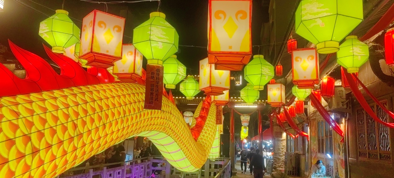 活动现场,宁溪镇的宋渠直街被华灯点亮,宛如白昼。蜿蜒游动的龙灯与千盏花灯相互交织,如梦如幻,古街在灯火的映照下,散发着“沉浸微醺”的独特韵味,游人如织,热闹非凡。龙盘巷道,绵延千米耀映宁溪,再现百年的灯火辉煌。“倡导科学生活方式,拒绝一切邪教活动”等反邪教元素花灯在宋渠直街檐廊随风摇曳,承载了人们美好期许。灯会期间,宋渠直街摇身一变,成了美食的天堂。宁溪的“火烧”、上郑的“笋干”、上垟的“淡水鱼”、屿头的“馒头”……等特色小吃摊位整齐排列,形成一幅多元融合的市集景观,志愿者手举“创导健康生活方式,防范抵御邪教侵害”等手牌,穿梭于赏花灯,看民间艺术表演、品美食等游客人群中,让人们在传承非遗文化活动中接受反邪教教育。