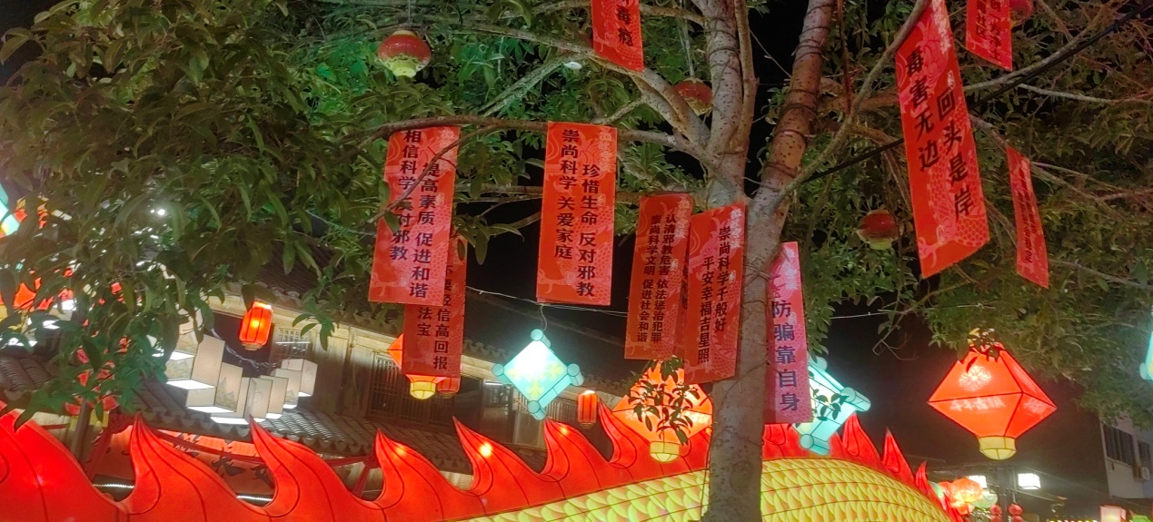 省级非遗“二月二灯会”,是黄岩宁溪镇一带的民间传统节日,为期三天的宁溪宋渠直街灯会隆重开启,台州市黄岩区融反邪教宣传于其中。
