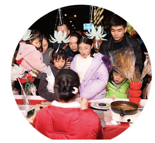 青年路两旁,各式精巧的花灯竞放光华,其中,以“马上有钱”“马上有缘”等为主题的马年生肖系列灯组,因其吉祥美好的寓意而备受青睐。许多市民在花灯前驻足流连,或拍照留念,或默许心愿,斑斓光影映亮一张张含笑的脸庞。人们穿行于老城新旧交织的建筑肌理之间,触摸城市记忆。