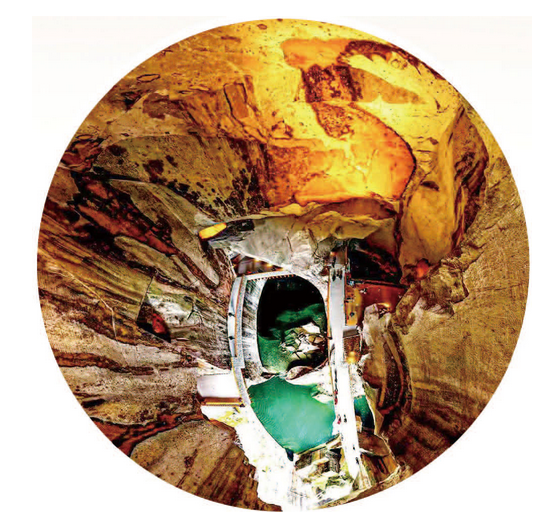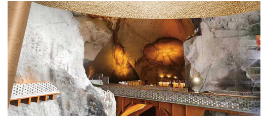 工程第一步是安全排险。大型机械无法进入,4700余处危岩加固点位全部依靠人工完成。隐形锚杆、裂隙注浆、沟槽静力切割,耗时8个月。岩壁上的天然岩画被完整保留。随后,架设编木拱桥和游廊步道,将运石隧道转化为交错连通的游览路线。栏板则使用采石废料加工,镂空造型减轻荷载,并与岩壁肌理呼应。
