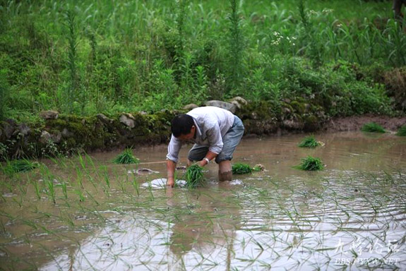 山区农民雨后插秧忙