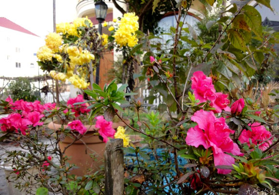 红杜鹃与金菊花寒冬争艳