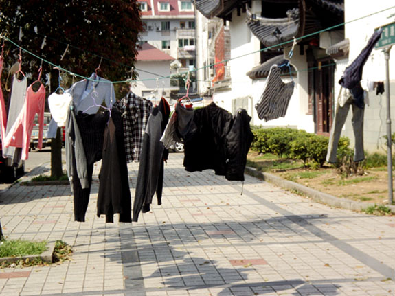 人行道上拉绳晒被子