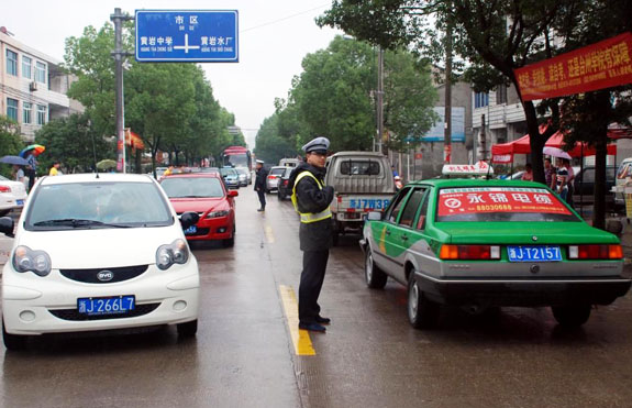 高考第一天,交警冒雨执勤保畅通