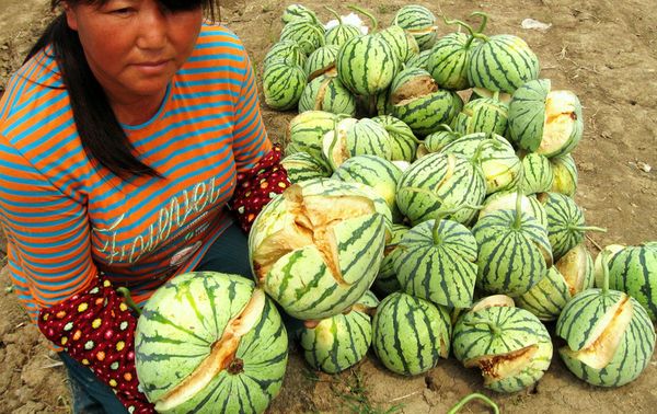 | 5月13日,江苏镇江瓜农在清理未成熟先爆裂的西瓜 |