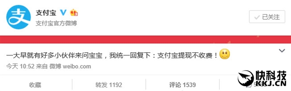 “一大早就有好多小伙伴来问宝宝,我统一回复下:支付宝提现不收费!”支付宝发微博称。